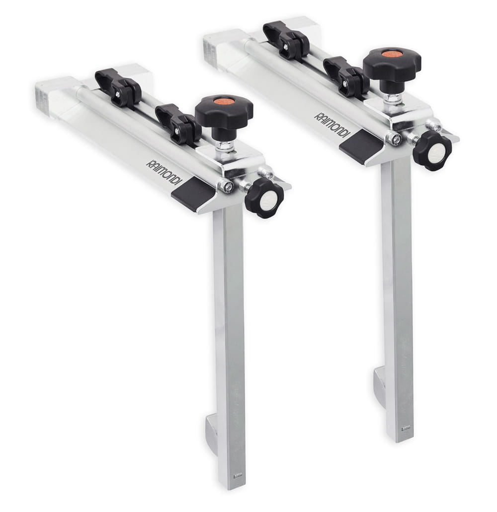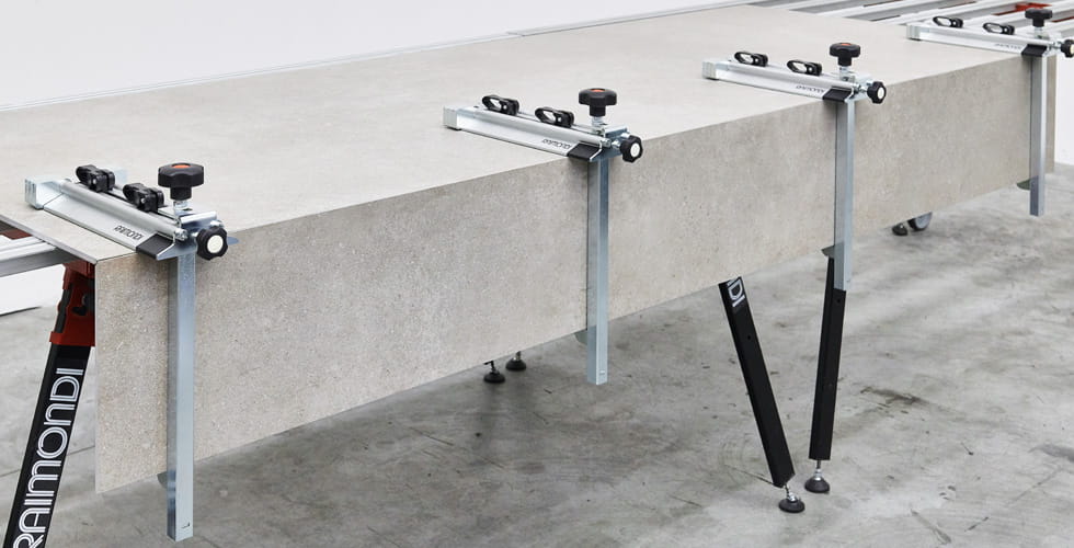 RAIMONDI TIP-TOP to para ukośnych zacisków do licowania ze sobą schodów, blatów, płytek, o dowolnej długości. Urządzenie zostało zaprojektowane i przeznaczone, do łatwego łączenia ze sobą dużej wielkości materiałów w pojedynkę, pod kątem 90° stopni. Dzięki regulacji za pomocą pokręteł w dwóch płaszczyznach, jesteśmy w stanie uzyskać perfekcyjne połączenie krawędzi, pod warunkiem prawidłowo wykonanego ukosowania oraz rzetelnej produkcji obrabianego przez nas materiału.